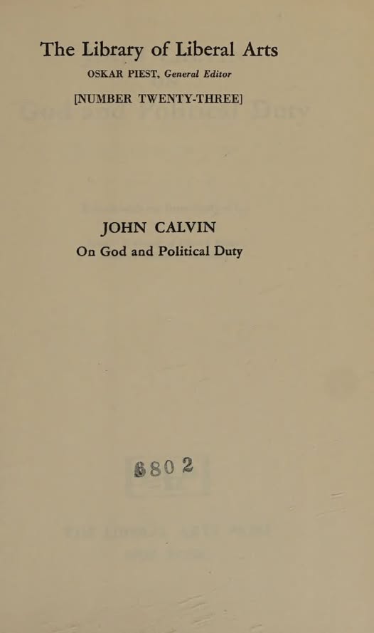 Spune Calvin atunci când motivează de ce studiază legile cetății: „Car aucuns nient qu'une République soit bien ordonnée, si en délaissant la police de Moyse, elle est gouvernée des communes loix des autres nations” („Căci sunt unii care neagă faptul că o republică ar putea fi bine condusă dacă se abate de la legile politice ale lui Moise și ar fi guvernată de legile comune ale altor națiuni”). În latină, în ediția originară: „Sunt enim qui recte compofitam effe rempublicam negent, quaa neglectis Mose politicis communibus Gentium legibus regitur”.