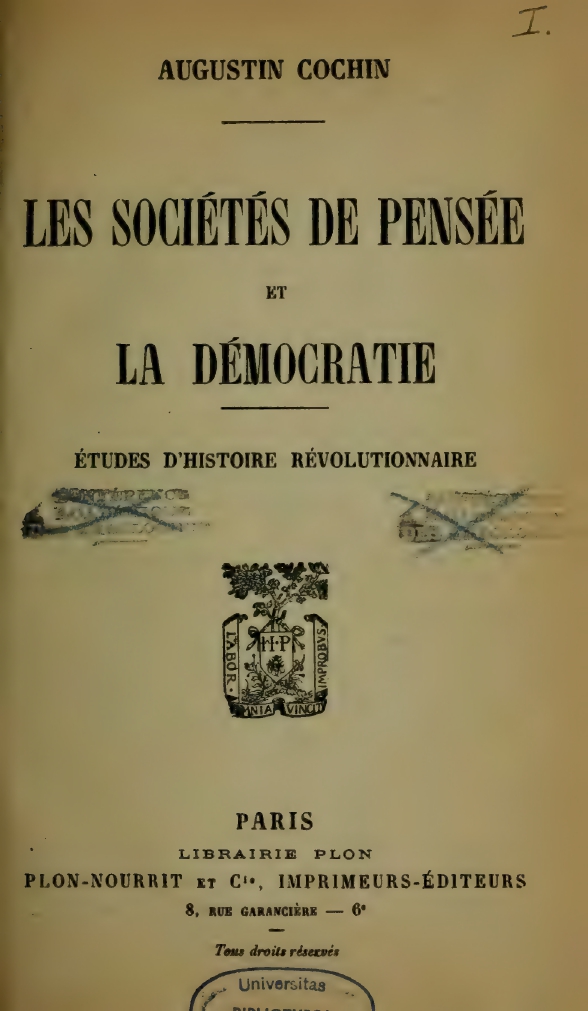 Voința generală, despre care eu însumi am scris recent că este o manifestare de tip „termodinamic” a voințelor particulare, este tălmăcită genial de A. Cochin, ca voință divină alungată din Rai. Un „paradis” în care Votul e sacrament. Dar totul e fals și nimeni nu mai crede în așa ceva, cu excepția unor societăți ale gândirii, unor secte (Barruel, diminuat pe alocuri, potențat prin stăpânirea emoției!) care nu fac decât să se adâncească în opinii false, necredință și impietate.